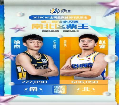 1月19日,CBA联赛公司对外公布了2026年全明星第二次票选的结果。虽然仍然处于伤病恢复阶段,但北汽男篮后卫赵睿仍然赢得了球迷们的认可与支持,他在这次投票中继续获得北区票王,他目前票数是606058。南区票王,也是全明星票王是广东男篮后卫徐杰,他目前票数是777890。