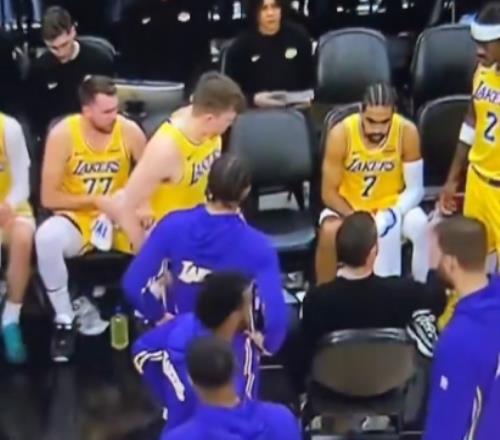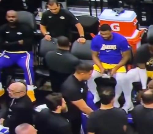 视频中复盘的球迷破防:“雷迪克正想对全队讲话呢,勒布朗你人在哪?有人看到勒布朗了吗?原来他在那儿像个受气的小媳妇儿一样撅嘴闹情绪呢。(Pouting like a little b**ch)”