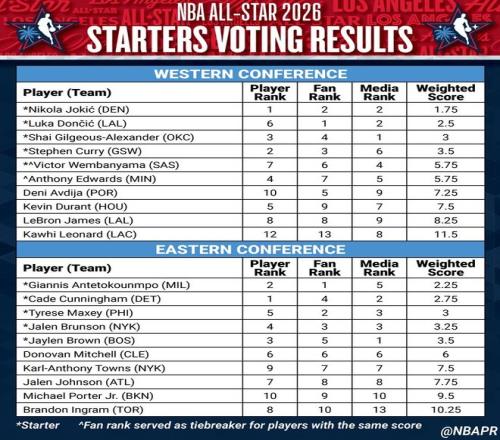 2026年NBA全明星赛首发球员由球迷、现役NBA球员以及媒体评审团共同选出。球迷投票占首发人选评选权重的50%,球员与媒体投票各占25%。所有投票统计完毕后,球员将按照投票群体划分,在东西部两个联盟内分别进行排名。每位球员的最终得分,由其在球迷投票、球员投票和媒体投票中的加权排名取平均值计算得出。